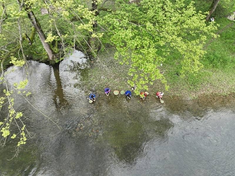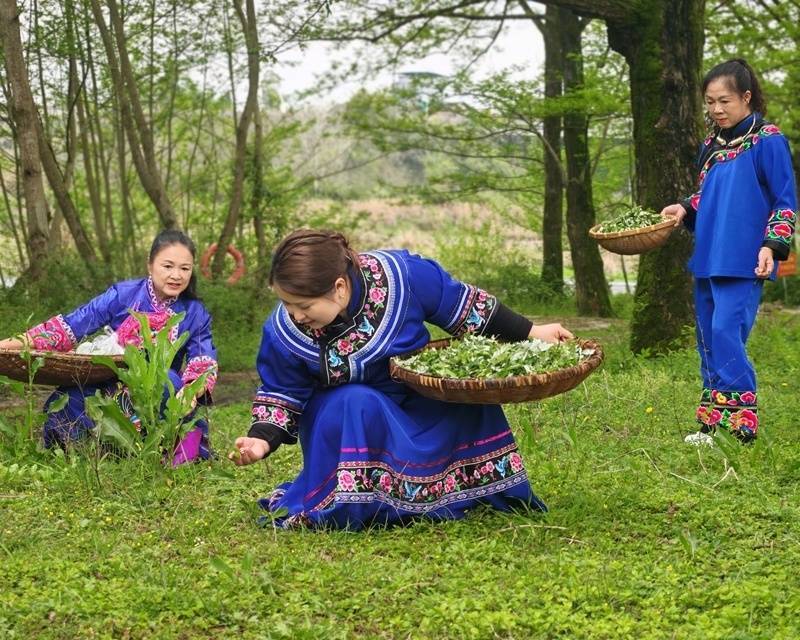 清晨松江河畔,柳枝吐绿。杨显慧带着几位身着苗族服饰的妇女,俯身采摘沾露的鲜嫩艾草与蒿菜。远处青山含黛,勾勒春日田园诗画。