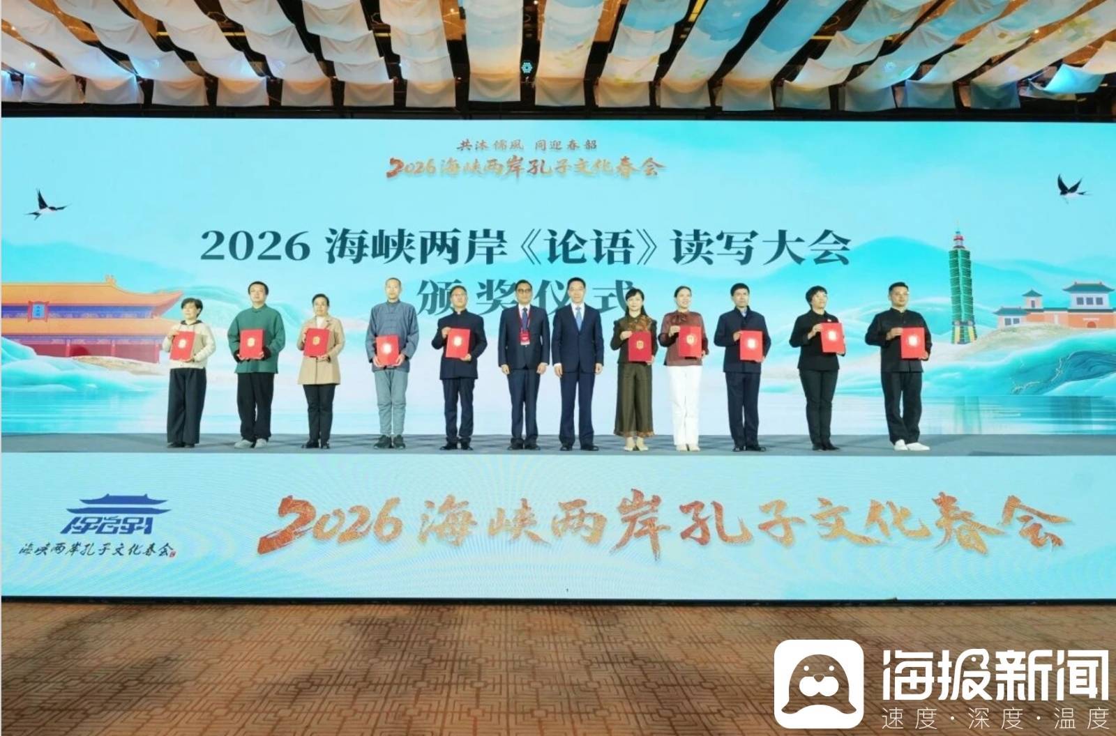 在2026海峡两岸孔子文化春会启动仪式现场,举行了2026海峡两岸《论语》读写大会颁奖仪式,与会领导嘉宾为荣获“海峡两岸《论语》传习人”称号的优秀代表颁奖。