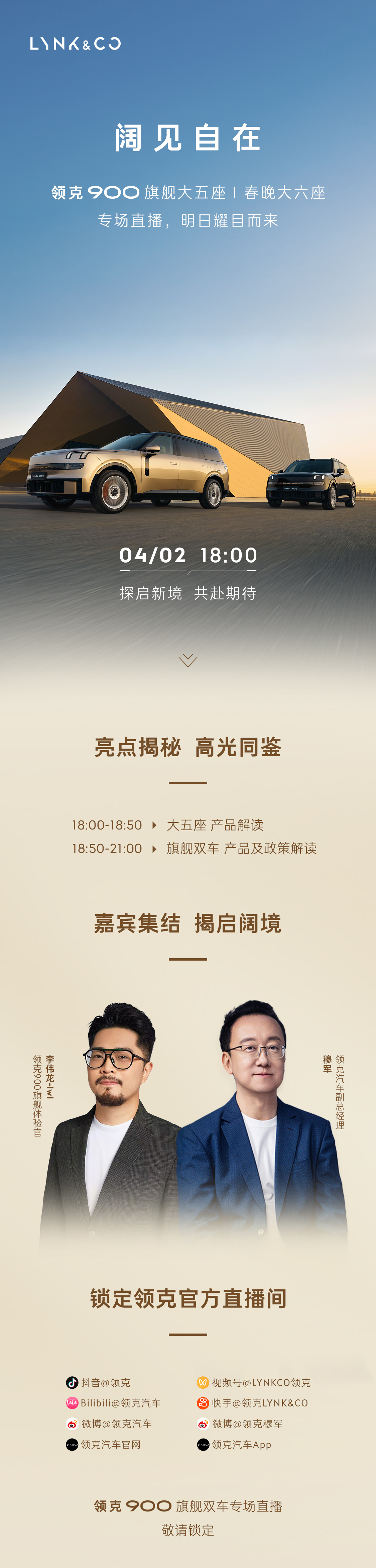 IT之家 4 月 1 日消息,今天上午,领克汽车官微宣布:领克 900 旗舰大五座、春晚大六座两款新车将于 4 月 2 日 18 时正式亮相。