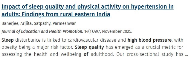 [1] Banerjee A, Satpathy P. Impact of sleep quality and physical activity on hypertension in adults: Findings from rural eastern India. J Educ Health Promot. 2025;14:497. Published 2025 Nov 28. doi:10.4103/jehp.jehp_2133_24